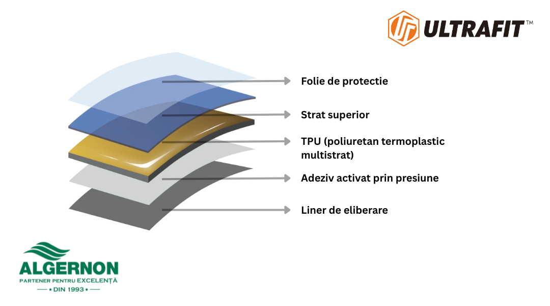 Liner-ul de protectie este din PET. Important! Acesta se indeparteaza de pe toata suprafata materialului in rola la prima utilizare, indiferent de cantitatea utilizata.