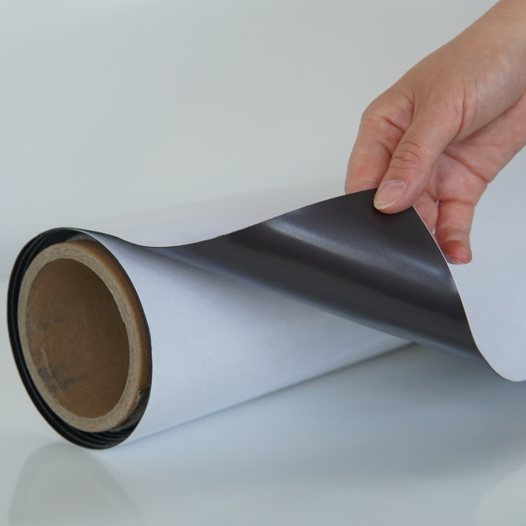 Folie magnetica laminata cu un folie adeziva alba mata pe partea nemagnetica.